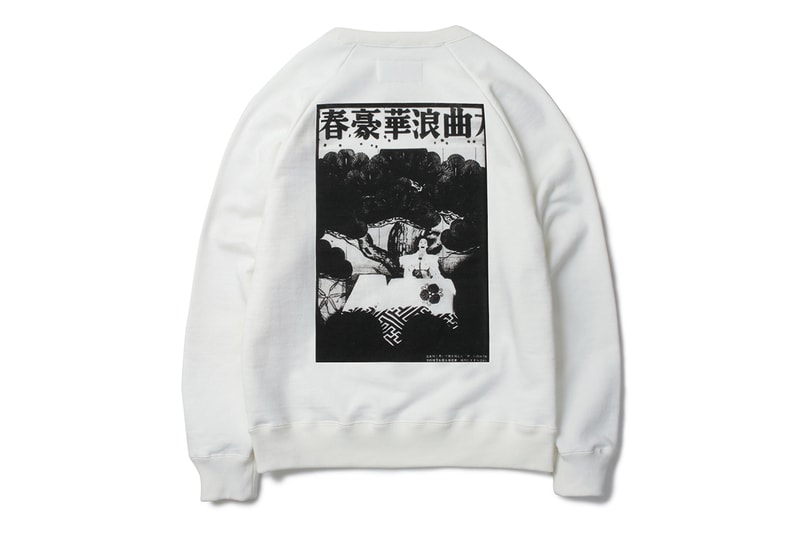Comprising six styles, the garments are all printed on white or black heavyweight crewneck sweaters and T-shirts to emphasize Moriyama’s artwork, which appears on the front of the tees and rear of the sweaters. The photographs range from shots of palm trees on a beach to flyers for call girls and sexually-charged films. One print showcases a neon sign for nudes (written in Japanese Katakana), while another displays a picture of a presenter sitting in front of a wall of traditional art.