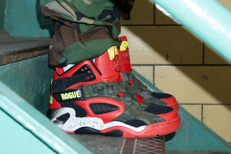 The collaborative Rogue sneaker sees a predominantly red leather upper get covered with black mesh and suede overlays and a camouflaged strap system. The colorway draws its inspiration from The War Report‘s album artwork and features bold neon wording from the iconic album cover on the tongues and heels of the shoe.