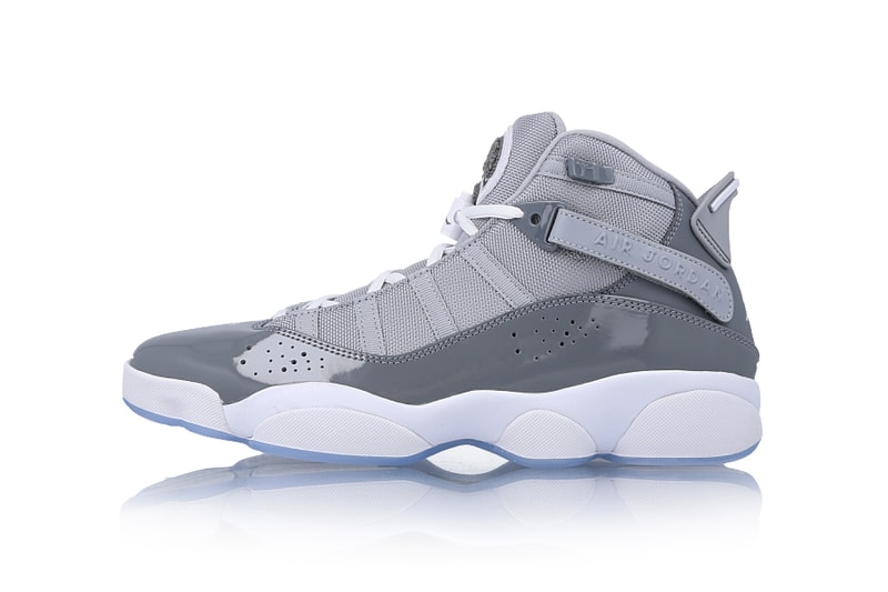 Featuring a fabric Jumpman patch on the tongue, straps taken from the Air Jordan 8 and logo-adorned heel tabs from the Air Jordan 6, the Jordan 6 Rings "Cool Grey" is available at select Jordan retailers such as Kicks Store, priced at $165 USD.