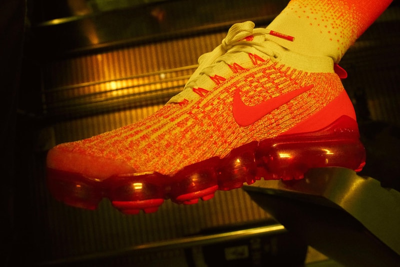 The aforementioned Air VaporMax Flyknit will be released in two different colorways, a dark knit with red hits interwoven throughout its upper and in a bold yellow-to-orange-to-red gradient. The Air Force 1 Lows come in either a black or white colorway and feature an eye-catching print on its back heel, while the Air Flightposites have been decked out with silver uppers. Elsewhere the Shox BB4 sports a skyline motif and the mismatched Jester XX features graffiti-styled graphics. Finally the Benassi JDI slides have been emblazoned with various basketball iconography.
