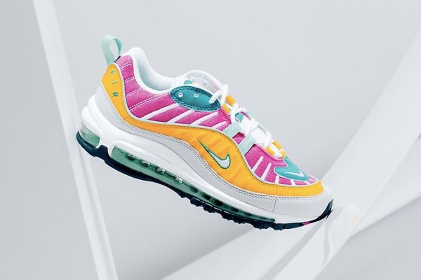 Following a steady stream of seasonal releases, Nike has just given the retro-inspired Air Max 98 a summer-ready makeover. This time around, the cult-favorite silhouette sees a bold upper sporting panelling in a turquoise "Spirit Teal" contrasted by a yellow "Tropical Twist" hue as well as a vibrant fuchsia tone. Stitched together with white seams as well as finished off with white laces, the sneaker is the ultimate statement piece to add to your rotation. All sat atop the Swoosh’s signature Air unit in a translucent blue, the shoe is all about standing out.