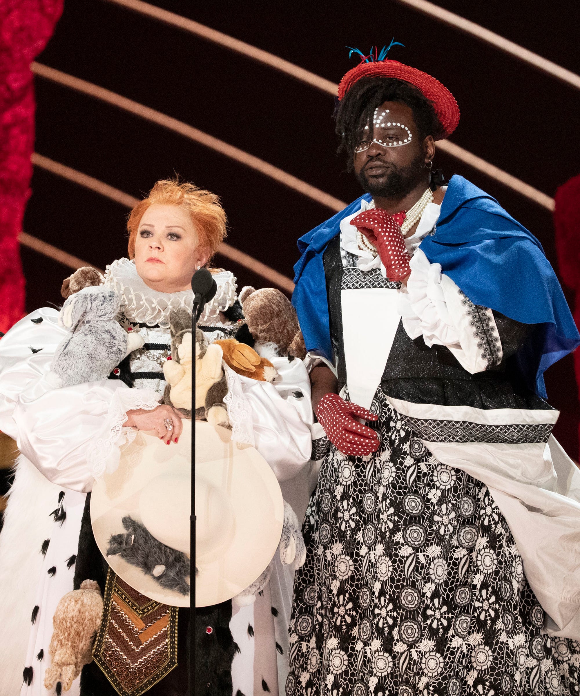 One of the best moments of the night came thanks to Melissa McCarthy and Brian Tyree Henry, who presented the award for Best Costume Design in style. When McCarthy and Henry walked on stage in their own respective representations of the nominated films in the category (a jumble of Mary Queen of Scots, The Favourite, Mary Poppins Returns, and Black Panther) we had to wonder, How the hell did they pull this off? Turns out, it happened quickly — very quickly.