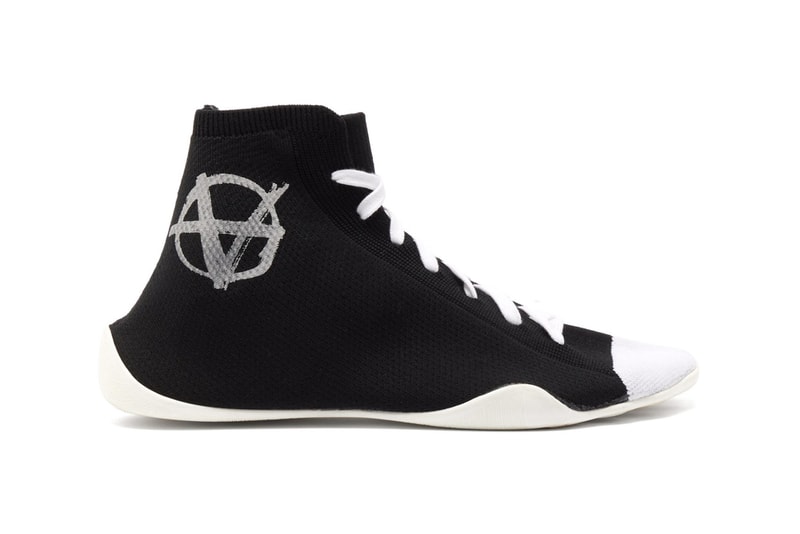 On the low-top black edition, an upside-down Anarchy motif is featured on the lateral side. It’s crafted of jersey knit and finished off with a white toe cap and white laces for contrast. The white edition is constructed of jacquard and offered in a high-top silhouette. A simple "Vetements" logo is stamped on the front, while a black outsole rounds it off.