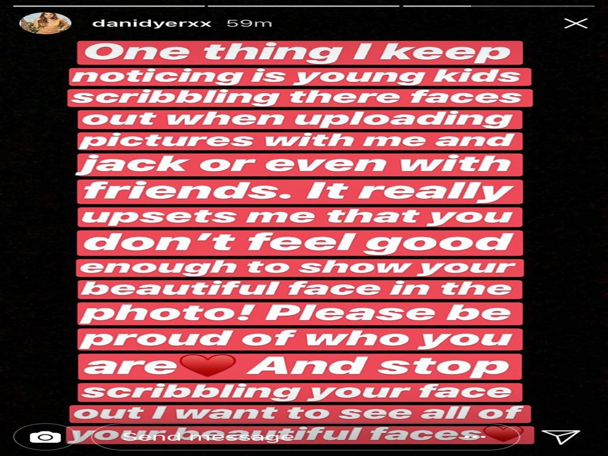 Celebrities, too, have noticed. In August 2018, after she won ITV2’s hit reality show Love Island, actress Dani Dyer lamented on her Instagram Stories that "young kids" scribbled out their faces when uploading pictures they’d taken after meeting her. "It really upsets me that you don’t feel good enough to show your beautiful face in the photo!" she wrote. "Stop scribbling your face out, I want to see all of your beautiful faces."